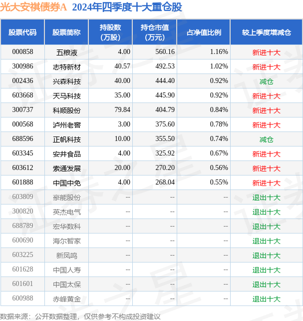 光大安祺债券A为债券型-混合二级基金,根据最新一期基金季报显示,该基金资产配置:股票占净值比13.95%,债券占净值比99.42%,现金占净值比1.31%。基金十大重仓股如下: