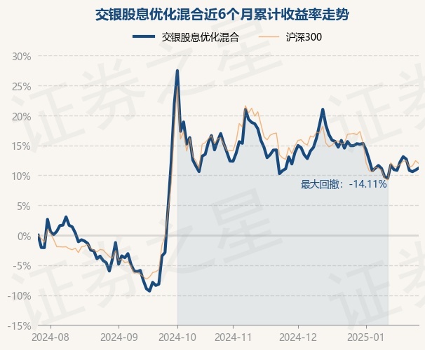 证券之星消息,1月27日,交银股息优化混合最新单位净值为1.8664元,累计净值为1.8664元,较前一交易日上涨0.3%。历史数据显示该基金近1个月下跌3.53%,近3个月下跌3.93%,近6个月上涨11.2%,近1年下跌8.77%。该基金近6个月的累计收益率走势如下图: