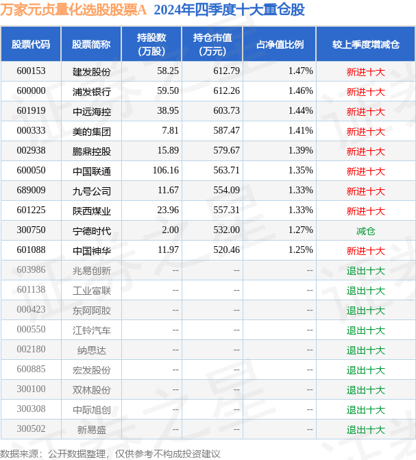万家元贞量化选股股票A为股票型基金,根据最新一期基金季报显示,该基金资产配置:股票占净值比94.03%,无债券类资产,现金占净值比7.12%。基金十大重仓股如下: