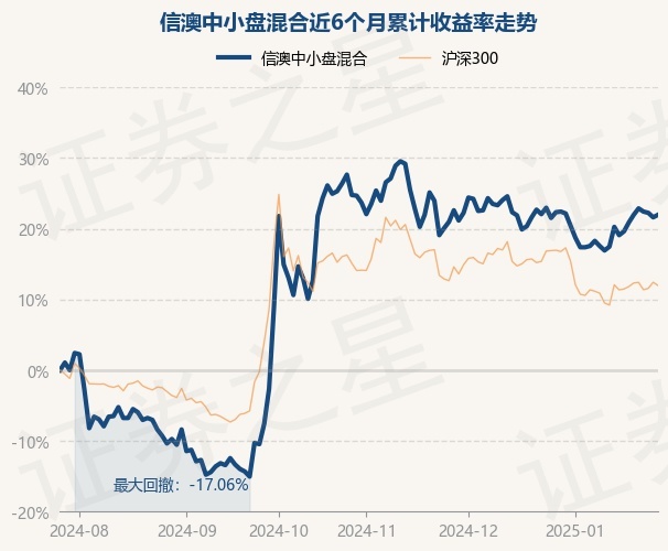 证券之星消息,1月27日,信澳中小盘混合最新单位净值为1.354元,累计净值为2.37元,较前一交易日上涨0.3%。历史数据显示该基金近1个月下跌0.37%,近3个月下跌3.49%,近6个月上涨21.98%,近1年上涨14.94%。该基金近6个月的累计收益率走势如下图: