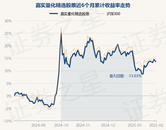 证券之星消息,2月5日,嘉实量化精选股票最新单位净值为1.298元,累计净值为1.649元,较前一交易日下跌0.2%。历史数据显示该基金近1个月上涨3.25%,近3个月下跌5.03%,近6个月上涨13.62%,近1年上涨21.04%。该基金近6个月的累计收益率走势如下图: