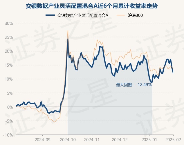 证券之星消息,2月5日,交银数据产业灵活配置混合A最新单位净值为1.5943元,累计净值为1.5943元,较前一交易日下跌1.57%。历史数据显示该基金近1个月上涨2.98%,近3个月下跌4.77%,近6个月上涨12.18%,近1年上涨24.27%。该基金近6个月的累计收益率走势如下图:
