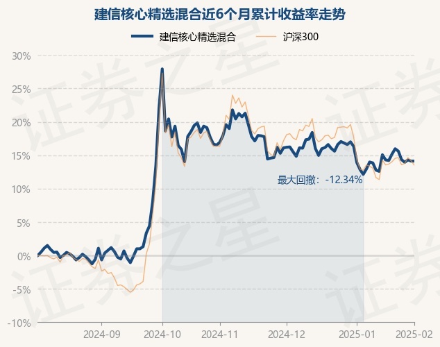 证券之星消息,2月5日,建信核心精选混合最新单位净值为2.507元,累计净值为3.903元,较前一交易日上涨0.0%。历史数据显示该基金近1个月上涨0.2%,近3个月下跌5.43%,近6个月上涨13.08%,近1年上涨15.8%。该基金近6个月的累计收益率走势如下图: