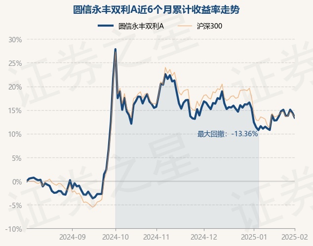 证券之星消息,2月5日,圆信永丰双利A最新单位净值为0.7841元,累计净值为2.5601元,较前一交易日下跌0.88%。历史数据显示该基金近1个月上涨1.82%,近3个月下跌5.95%,近6个月上涨13.39%,近1年上涨17.66%。该基金近6个月的累计收益率走势如下图: