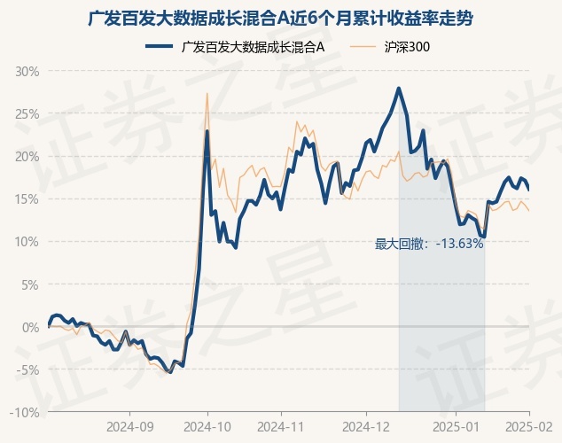 证券之星消息,2月5日,广发百发大数据成长混合A最新单位净值为1.265元,累计净值为1.322元,较前一交易日下跌0.86%。历史数据显示该基金近1个月上涨3.69%,近3个月下跌1.94%,近6个月上涨16.06%,近1年上涨24.51%。该基金近6个月的累计收益率走势如下图: