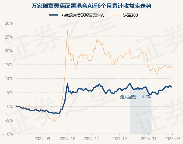 证券之星消息,2月5日,万家瑞富灵活配置混合A最新单位净值为0.9371元,累计净值为1.1424元,较前一交易日上涨0.33%。历史数据显示该基金近1个月上涨2.89%,近3个月上涨0.39%,近6个月上涨7.18%,近1年上涨10.14%。该基金近6个月的累计收益率走势如下图: