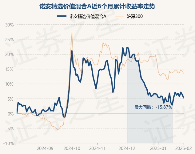 证券之星消息,2月5日,诺安精选价值混合A最新单位净值为0.9684元,累计净值为0.9684元,较前一交易日下跌1.0%。历史数据显示该基金近1个月上涨0.03%,近3个月下跌8.35%,近6个月上涨5.31%,近1年上涨27.0%。该基金近6个月的累计收益率走势如下图: