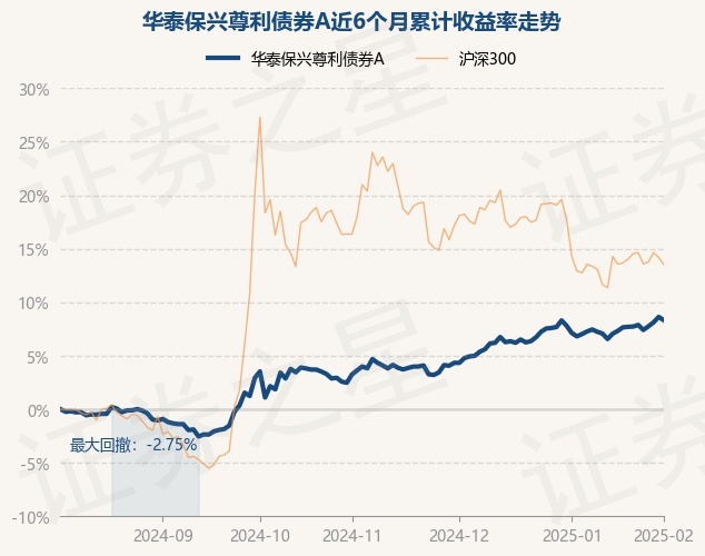 证券之星消息,2月5日,华泰保兴尊利债券A最新单位净值为1.2312元,累计净值为1.4557元,较前一交易日下跌0.28%。历史数据显示该基金近1个月上涨1.41%,近3个月上涨4.17%,近6个月上涨8.34%,近1年上涨14.71%。该基金近6个月的累计收益率走势如下图: