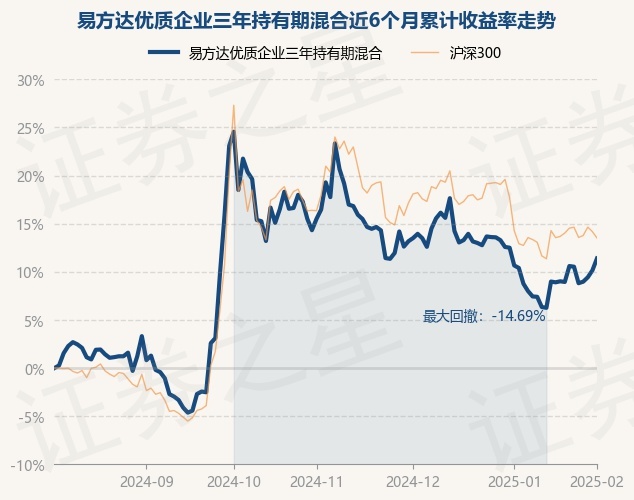 证券之星消息,2月5日,易方达优质企业三年持有期混合最新单位净值为0.858元,累计净值为0.858元,较前一交易日上涨1.13%。历史数据显示该基金近1个月上涨0.89%,近3个月下跌6.63%,近6个月上涨11.39%,近1年上涨14.95%。该基金近6个月的累计收益率走势如下图: