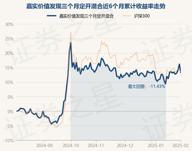 证券之星消息,2月5日,嘉实价值发现三个月定开混合最新单位净值为0.9692元,累计净值为1.0671元,较前一交易日下跌2.49%。历史数据显示该基金近1个月上涨2.69%,近3个月下跌2.73%,近6个月上涨13.28%,近1年上涨21.01%。该基金近6个月的累计收益率走势如下图: