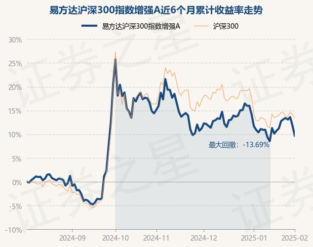证券之星消息,2月5日,易方达沪深300指数增强A最新单位净值为0.7534元,累计净值为0.7534元,较前一交易日下跌1.9%。历史数据显示该基金近1个月下跌1.1%,近3个月下跌7.6%,近6个月上涨9.71%,近1年上涨23.45%。该基金近6个月的累计收益率走势如下图: