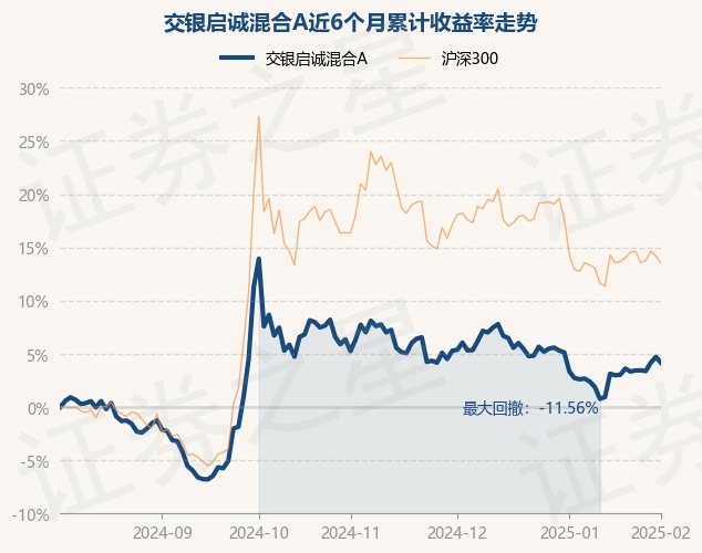 证券之星消息,2月5日,交银启诚混合A最新单位净值为1.0748元,累计净值为1.0748元,较前一交易日下跌0.53%。历史数据显示该基金近1个月上涨1.4%,近3个月下跌3.32%,近6个月上涨4.16%,近1年上涨14.32%。该基金近6个月的累计收益率走势如下图: