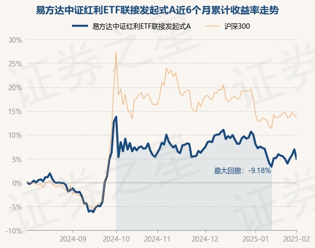 证券之星消息,2月5日,易方达中证红利ETF联接发起式A最新单位净值为1.188元,累计净值为1.388元,较前一交易日下跌1.87%。历史数据显示该基金近1个月下跌2.09%,近3个月下跌3.15%,近6个月上涨5.02%,近1年上涨10.12%。该基金近6个月的累计收益率走势如下图: