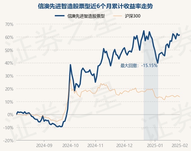 证券之星消息,2月5日,信澳先进智造股票型最新单位净值为1.883元,累计净值为2.5033元,较前一交易日上涨0.31%。历史数据显示该基金近1个月上涨12.53%,近3个月上涨17.6%,近6个月上涨61.62%,近1年上涨77.22%。该基金近6个月的累计收益率走势如下图: