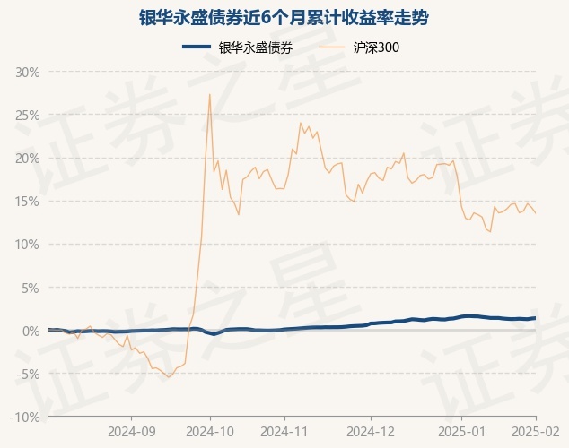 证券之星消息,2月5日,银华永盛债券最新单位净值为1.0874元,累计净值为1.1624元,较前一交易日上涨0.05%。历史数据显示该基金近1个月下跌0.22%,近3个月上涨1.25%,近6个月上涨1.35%,近1年上涨3.94%。该基金近6个月的累计收益率走势如下图: