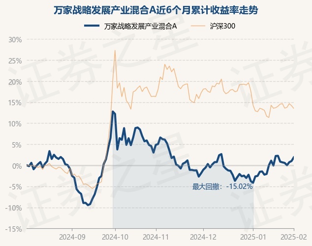 证券之星消息,2月5日,万家战略发展产业混合A最新单位净值为0.8345元,累计净值为0.8345元,较前一交易日上涨0.87%。历史数据显示该基金近1个月上涨4.64%,近3个月下跌4.43%,近6个月上涨1.88%,近1年上涨27.42%。该基金近6个月的累计收益率走势如下图: