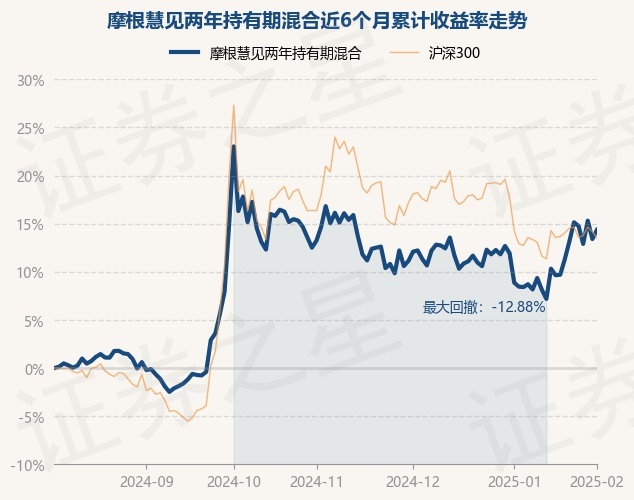 证券之星消息,2月5日,摩根慧见两年持有期混合最新单位净值为0.7424元,累计净值为0.7424元,较前一交易日上涨0.84%。历史数据显示该基金近1个月上涨5.44%,近3个月下跌2.11%,近6个月上涨14.36%,近1年上涨19.11%。该基金近6个月的累计收益率走势如下图: