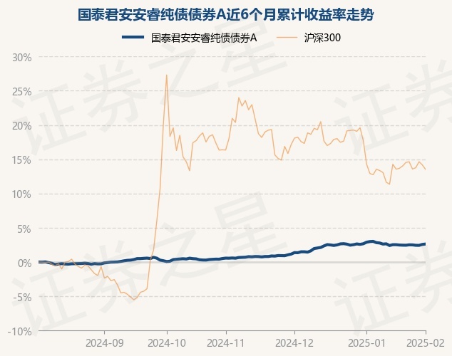 证券之星消息,2月5日,国泰君安安睿纯债债券A最新单位净值为1.0415元,累计净值为1.0665元,较前一交易日上涨0.06%。历史数据显示该基金近1个月下跌0.34%,近3个月上涨2.03%,近6个月上涨2.63%,近1年上涨5.6%。该基金近6个月的累计收益率走势如下图: