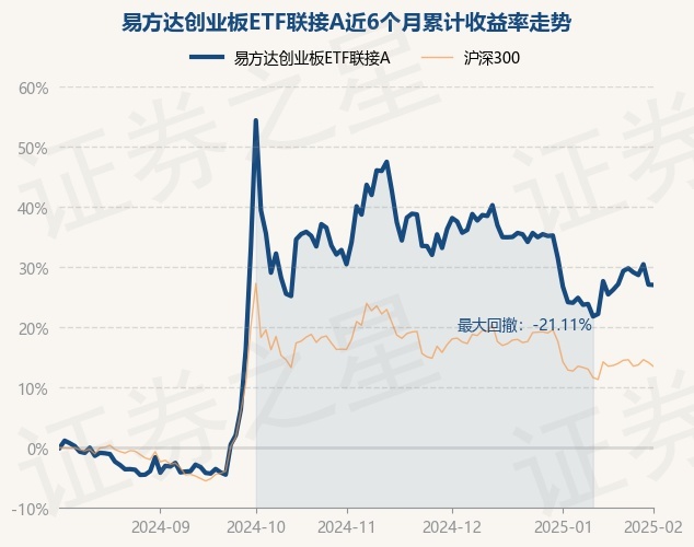 证券之星消息,2月5日,易方达创业板ETF联接A最新单位净值为2.1218元,累计净值为2.1218元,较前一交易日下跌0.05%。历史数据显示该基金近1个月上涨2.3%,近3个月下跌9.33%,近6个月上涨27.05%,近1年上涨30.56%。该基金近6个月的累计收益率走势如下图:
