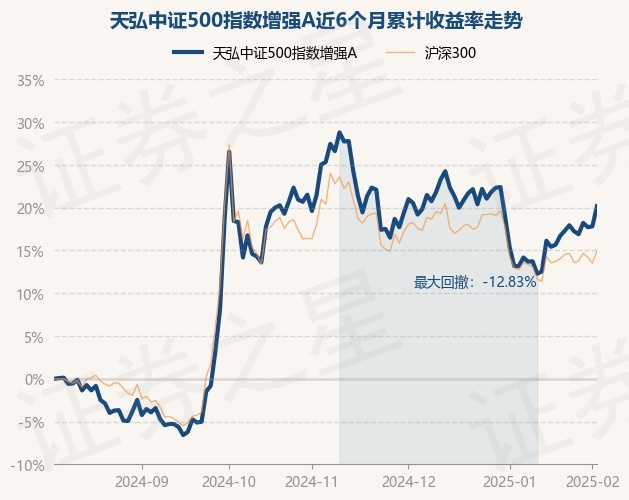 证券之星消息,2月6日,天弘中证500指数增强A最新单位净值为1.1791元,累计净值为1.1791元,较前一交易日上涨2.01%。历史数据显示该基金近1个月上涨6.2%,近3个月下跌4.12%,近6个月上涨20.17%,近1年上涨24.04%。该基金近6个月的累计收益率走势如下图: