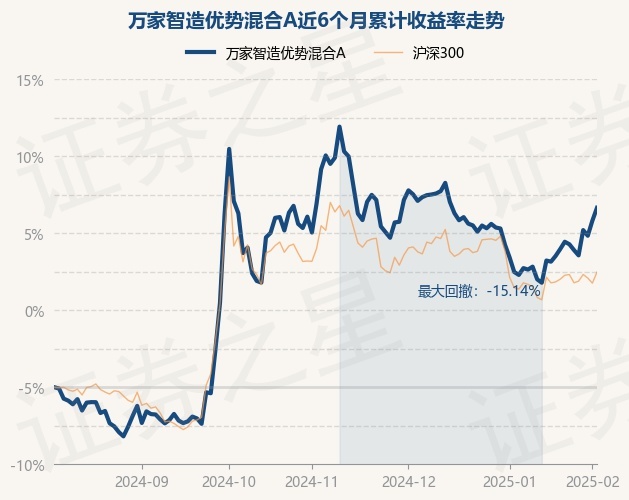 证券之星消息,2月6日,万家智造优势混合A最新单位净值为2.5068元,累计净值为3.0467元,较前一交易日上涨1.37%。历史数据显示该基金近1个月上涨7.6%,近3个月下跌5.23%,近6个月上涨23.31%,近1年上涨33.12%。该基金近6个月的累计收益率走势如下图: