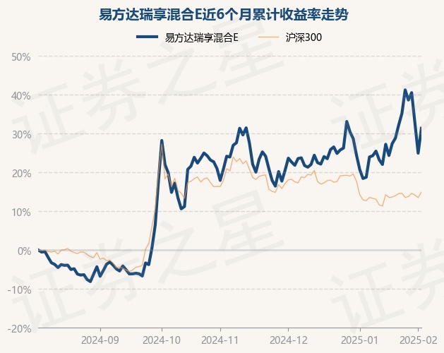 证券之星消息,2月6日,易方达瑞享混合E最新单位净值为2.5775元,累计净值为2.5775元,较前一交易日上涨5.13%。历史数据显示该基金近1个月上涨10.61%,近3个月上涨5.96%,近6个月上涨31.37%,近1年上涨28.43%。该基金近6个月的累计收益率走势如下图: