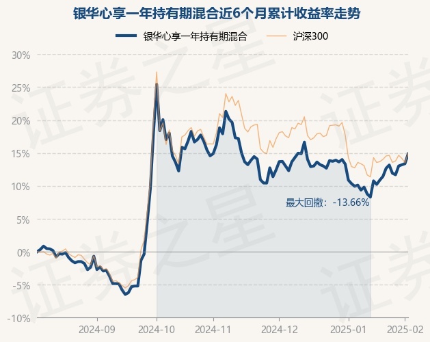证券之星消息,2月6日,银华心享一年持有期混合最新单位净值为0.6905元,累计净值为0.6905元,较前一交易日上涨1.31%。历史数据显示该基金近1个月上涨4.46%,近3个月下跌2.6%,近6个月上涨14.85%,近1年上涨12.35%。该基金近6个月的累计收益率走势如下图: