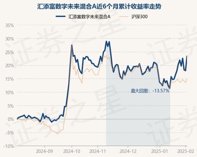 证券之星消息,2月6日,汇添富数字未来混合A最新单位净值为0.6407元,累计净值为0.6407元,较前一交易日上涨4.52%。历史数据显示该基金近1个月上涨9.71%,近3个月上涨1.59%,近6个月上涨23.31%,近1年上涨26.0%。该基金近6个月的累计收益率走势如下图: