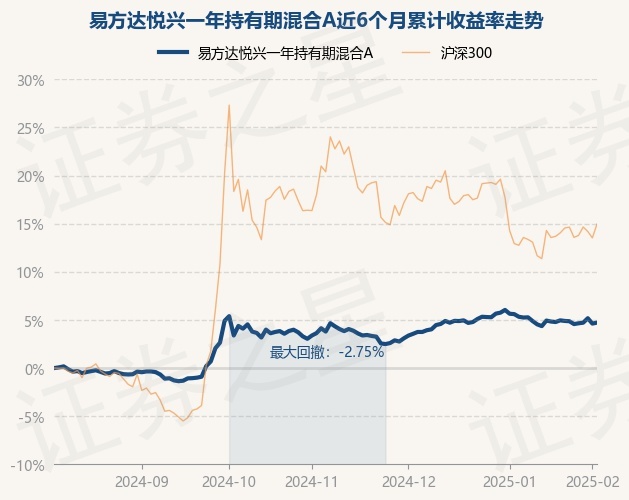 证券之星消息,2月6日,易方达悦兴一年持有期混合A最新单位净值为1.0341元,累计净值为1.0341元,较前一交易日上涨0.1%。历史数据显示该基金近1个月下跌0.58%,近3个月上涨0.9%,近6个月上涨4.72%,近1年上涨7.73%。该基金近6个月的累计收益率走势如下图: