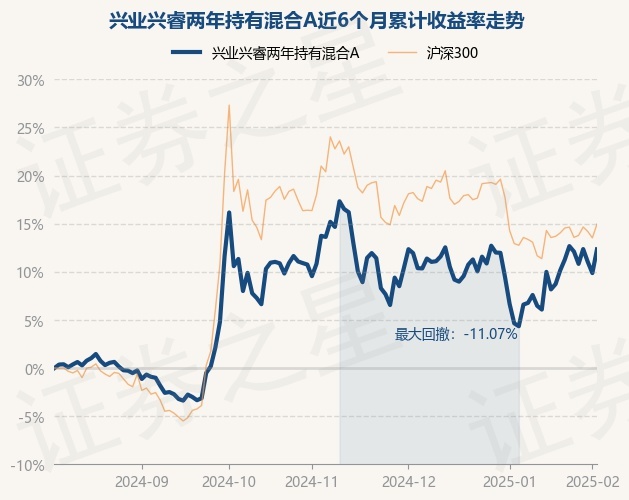证券之星消息,2月6日,兴业兴睿两年持有混合A最新单位净值为0.8098元,累计净值为0.8098元,较前一交易日上涨2.25%。历史数据显示该基金近1个月上涨7.66%,近3个月下跌1.14%,近6个月上涨12.33%,近1年上涨14.57%。该基金近6个月的累计收益率走势如下图: