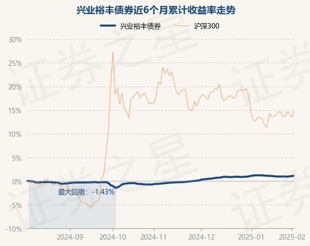 证券之星消息,2月6日,兴业裕丰债券最新单位净值为1.0834元,累计净值为1.3184元,较前一交易日上涨0.06%。历史数据显示该基金近1个月下跌0.1%,近3个月上涨1.67%,近6个月上涨1.12%,近1年上涨4.03%。该基金近6个月的累计收益率走势如下图: