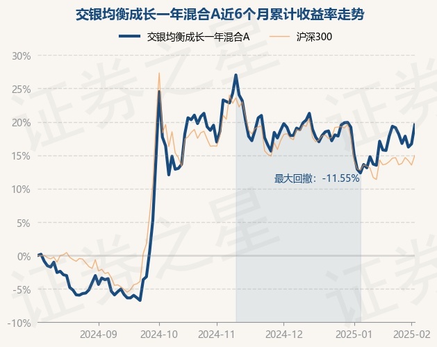 证券之星消息,2月6日,交银均衡成长一年混合A最新单位净值为0.8249元,累计净值为0.8879元,较前一交易日上涨2.45%。历史数据显示该基金近1个月上涨6.41%,近3个月下跌2.84%,近6个月上涨19.55%,近1年上涨21.56%。该基金近6个月的累计收益率走势如下图: