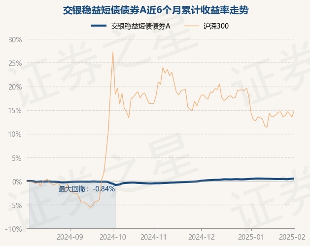证券之星消息,2月6日,交银稳益短债债券A最新单位净值为1.033元,累计净值为1.06元,较前一交易日上涨0.03%。历史数据显示该基金近1个月上涨0.0%,近3个月上涨0.99%,近6个月上涨0.54%,近1年上涨2.41%。该基金近6个月的累计收益率走势如下图: