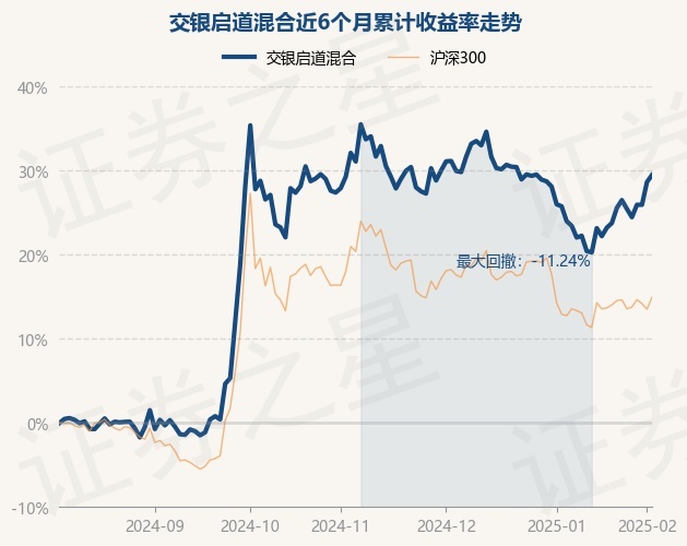 证券之星消息,2月6日,交银启道混合最新单位净值为0.6319元,累计净值为0.6319元,较前一交易日上涨0.65%。历史数据显示该基金近1个月上涨4.43%,近3个月下跌1.22%,近6个月上涨29.49%,近1年上涨31.1%。该基金近6个月的累计收益率走势如下图: