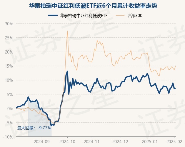 证券之星消息,2月6日,华泰柏瑞中证红利低波ETF最新单位净值为1.0772元,累计净值为2.1544元,较前一交易日上涨0.04%。历史数据显示该基金近1个月下跌0.94%,近3个月下跌1.64%,近6个月上涨6.97%,近1年上涨12.22%。该基金近6个月的累计收益率走势如下图: