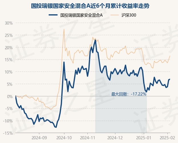 证券之星消息,2月7日,国投瑞银国家安全混合A最新单位净值为1.04元,累计净值为1.199元,较前一交易日上涨0.22%。历史数据显示该基金近1个月上涨3.36%,近3个月下跌9.25%,近6个月上涨6.89%,近1年上涨22.35%。该基金近6个月的累计收益率走势如下图: