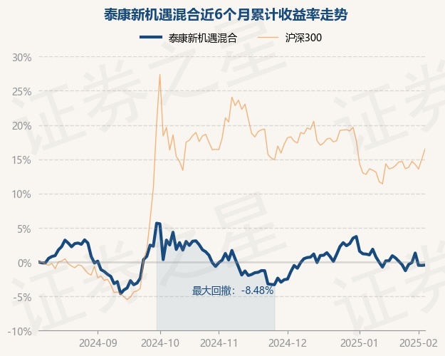 证券之星消息,2月7日,泰康新机遇混合最新单位净值为1.1238元,累计净值为1.4908元,较前一交易日上涨0.04%。历史数据显示该基金近1个月下跌1.47%,近3个月下跌2.1%,近6个月下跌0.44%,近1年上涨0.48%。该基金近6个月的累计收益率走势如下图: