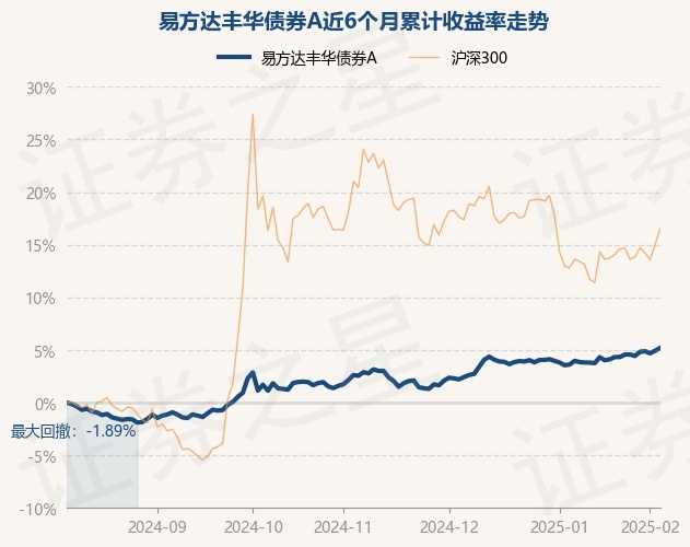 证券之星消息,2月7日,易方达丰华债券A最新单位净值为1.3275元,累计净值为1.5421元,较前一交易日上涨0.26%。历史数据显示该基金近1个月上涨1.18%,近3个月上涨2.23%,近6个月上涨5.19%,近1年上涨7.78%。该基金近6个月的累计收益率走势如下图: