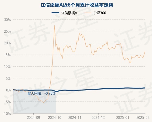 证券之星消息,2月7日,江信添福A最新单位净值为1.3499元,累计净值为1.3599元,较前一交易日上涨0.01%。历史数据显示该基金近1个月上涨0.02%,近3个月上涨0.96%,近6个月上涨0.79%,近1年上涨2.46%。该基金近6个月的累计收益率走势如下图: