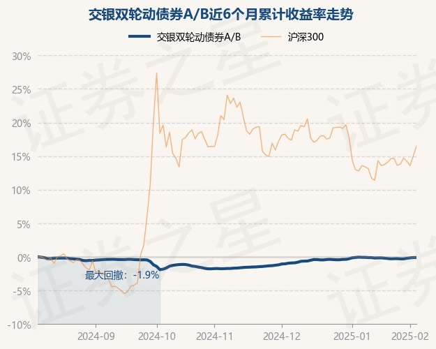 证券之星消息,2月7日,交银双轮动债券A/B最新单位净值为1.074元,累计净值为1.519元,较前一交易日上涨0.0%。历史数据显示该基金近1个月下跌0.03%,近3个月上涨1.66%,近6个月下跌0.1%,近1年上涨2.08%。该基金近6个月的累计收益率走势如下图: