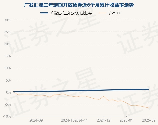 证券之星消息,2月7日,广发汇浦三年定期开放债券最新单位净值为1.0112元,累计净值为1.1296元,较前一交易日上涨0.05%。历史数据显示该基金近1个月上涨0.17%,近3个月上涨0.56%,近6个月上涨1.09%,近1年上涨2.43%。该基金近6个月的累计收益率走势如下图: