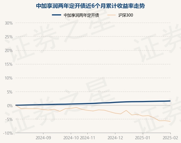 证券之星消息,2月7日,中加享润两年定开债最新单位净值为1.0074元,累计净值为1.1449元,较前一交易日上涨0.07%。历史数据显示该基金近1个月上涨0.22%,近3个月上涨0.93%,近6个月上涨1.54%,近1年上涨2.72%。该基金近6个月的累计收益率走势如下图: