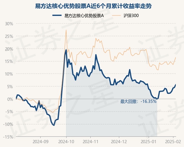 证券之星消息,2月7日,易方达核心优势股票A最新单位净值为0.6806元,累计净值为0.6806元,较前一交易日上涨1.01%。历史数据显示该基金近1个月上涨4.71%,近3个月下跌10.16%,近6个月上涨5.57%,近1年上涨5.19%。该基金近6个月的累计收益率走势如下图: