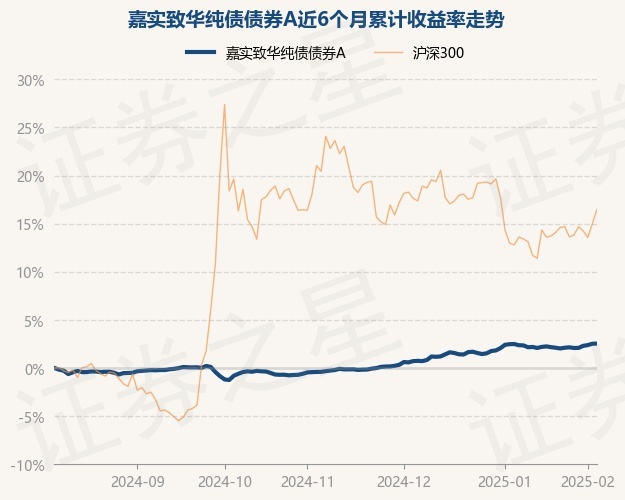 证券之星消息,2月7日,嘉实致华纯债债券A最新单位净值为1.0641元,累计净值为1.1894元,较前一交易日上涨0.01%。历史数据显示该基金近1个月上涨0.16%,近3个月上涨2.87%,近6个月上涨2.53%,近1年上涨5.83%。该基金近6个月的累计收益率走势如下图: