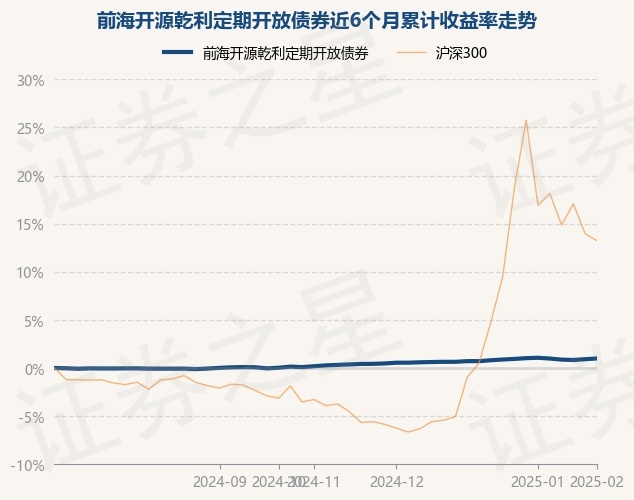 证券之星消息,2月7日,前海开源乾利定期开放债券最新单位净值为1.0093元,累计净值为1.18元,较前一交易日上涨0.08%。历史数据显示该基金近1个月下跌0.07%,近3个月上涨0.81%,近6个月上涨0.1%,近1年上涨1.76%。该基金近6个月的累计收益率走势如下图:
