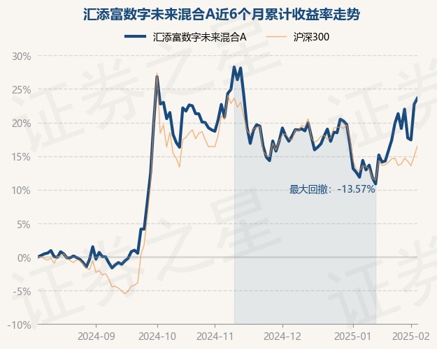 证券之星消息,2月7日,汇添富数字未来混合A最新单位净值为0.6454元,累计净值为0.6454元,较前一交易日上涨0.73%。历史数据显示该基金近1个月上涨8.09%,近3个月下跌0.57%,近6个月上涨23.62%,近1年上涨25.86%。该基金近6个月的累计收益率走势如下图: