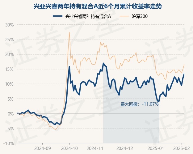 证券之星消息,2月7日,兴业兴睿两年持有混合A最新单位净值为0.8202元,累计净值为0.8202元,较前一交易日上涨1.28%。历史数据显示该基金近1个月上涨6.74%,近3个月下跌1.23%,近6个月上涨13.37%,近1年上涨13.3%。该基金近6个月的累计收益率走势如下图: