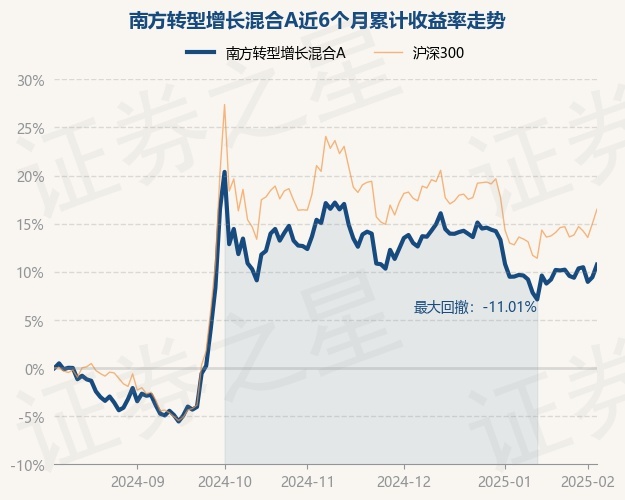 证券之星消息,2月7日,南方转型增长混合A最新单位净值为1.8638元,累计净值为1.8638元,较前一交易日上涨1.19%。历史数据显示该基金近1个月上涨0.98%,近3个月下跌5.46%,近6个月上涨10.74%,近1年上涨11.87%。该基金近6个月的累计收益率走势如下图: