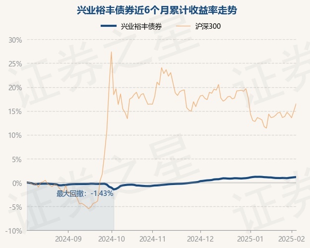 证券之星消息,2月7日,兴业裕丰债券最新单位净值为1.0839元,累计净值为1.3189元,较前一交易日上涨0.05%。历史数据显示该基金近1个月下跌0.05%,近3个月上涨1.66%,近6个月上涨1.15%,近1年上涨4.07%。该基金近6个月的累计收益率走势如下图: