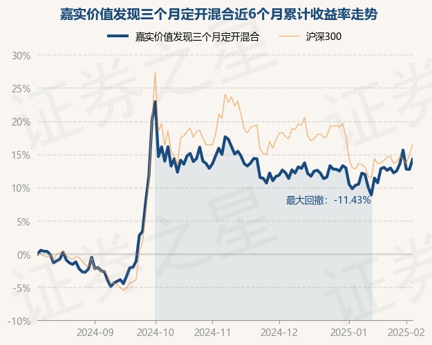 证券之星消息,2月7日,嘉实价值发现三个月定开混合最新单位净值为0.9821元,累计净值为1.08元,较前一交易日上涨1.36%。历史数据显示该基金近1个月上涨3.4%,近3个月下跌2.87%,近6个月上涨14.26%,近1年上涨15.72%。该基金近6个月的累计收益率走势如下图: